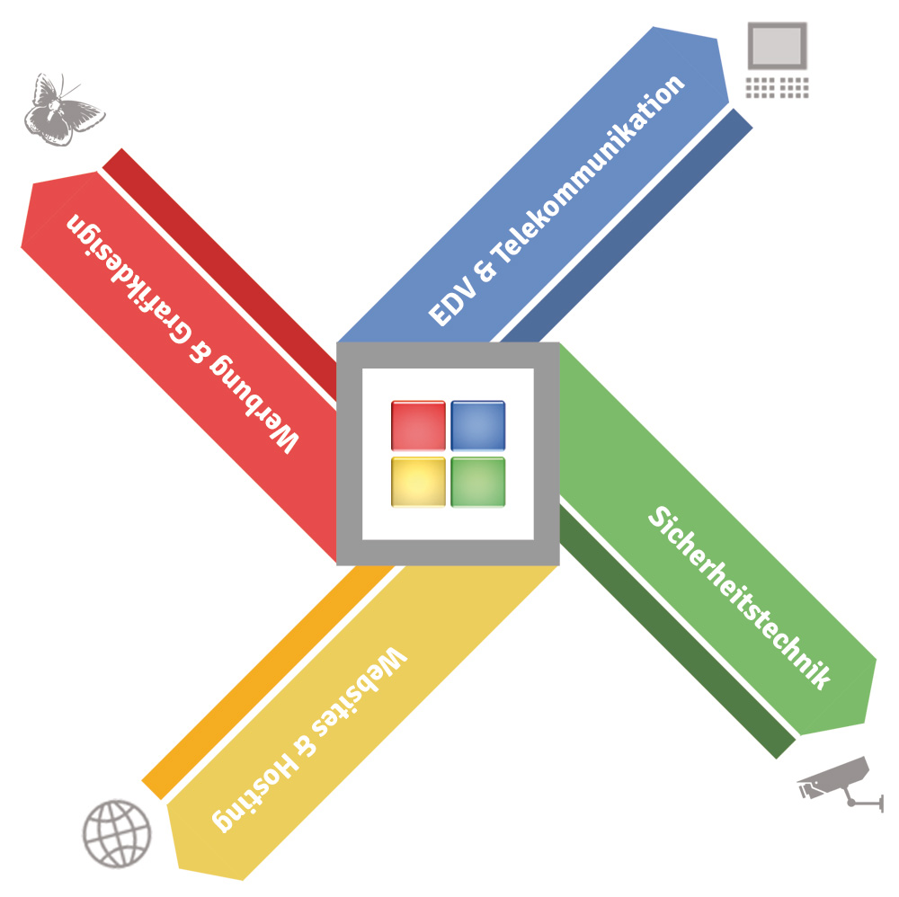 Als regional verwurzelter Dienstleister verbinden wir 4 Tätigkeitsschwerpunkte auf den Gebieten EDV & Telekommunikation, Sicherheitstechnik & Zugangskontrolle, Websites/-shops & Webhosting sowie Werbung & Grafikdesign mit eigenen Mitarbeitern in unserem Unternehmen.