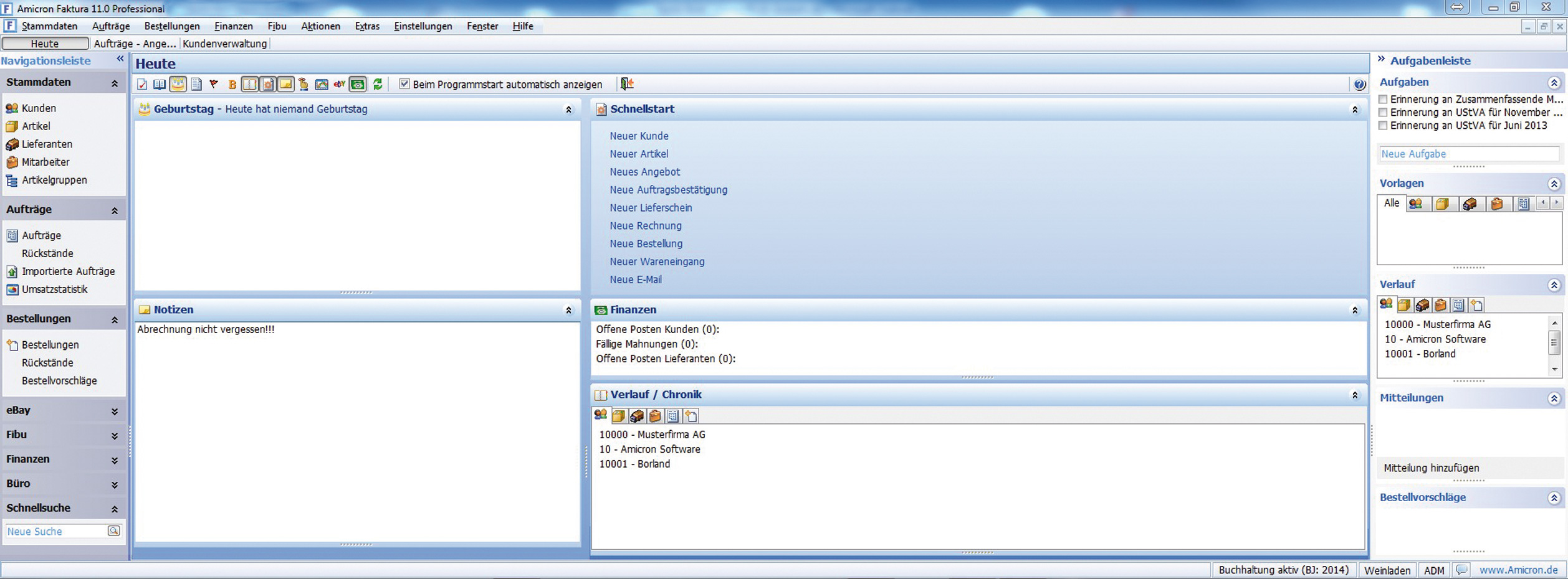 Das Programm wird seit 1990 in über 300 verschiedenen Branchen genutzt und kann sowohl als Einzelplatzversion als auch im Netzwerk eingesetzt werden. Beim gemeinsamen Einsatz mit Amicron-Mailoffice erhalten Sie zudem ein integriertes Paket, das Auftragsbearbeitung, Buchführung, Kontakt- und E-Mail-Management, Marketing und eCommerce so vereint, wie Sie es sich schon immer erträumt haben.